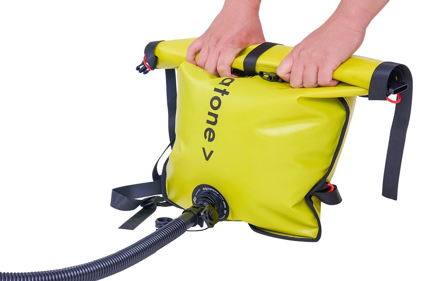 THE SMART DESIGN SIMPLIFIES THE INFLATION PROCESS—JUST CAPTURE AIR AND TRANSFER IT TO YOUR BOAT USING THE INFLATION HOSE. CONNECT THE HOSE TO THE BAG AND BOSTON VALVE ON THE BOAT, THEN OPEN THE BAG WIDE. QUICKLY FOLD THE TOP OPENING CLOSED, AND GENTLY SQUEEZE THE BAG TO PUSH AIR INTO THE BOAT'S CHAMBER.